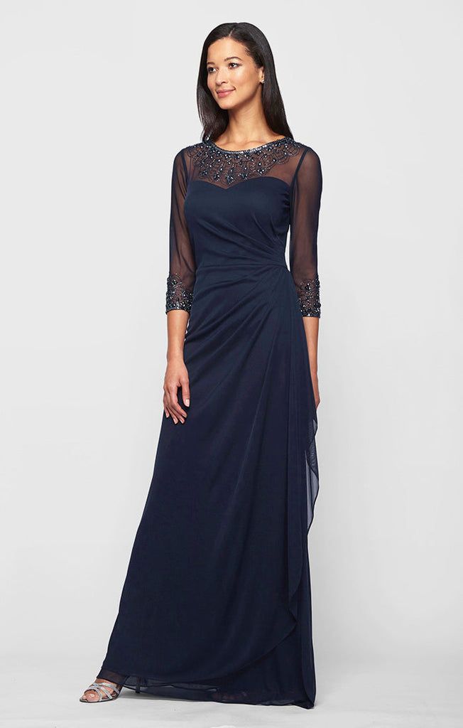3/4 Sleeve Lace and Chiffon Gown with Scalloped Lace Detail