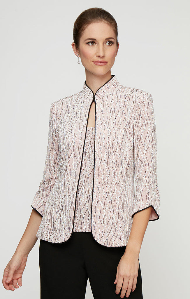 3/4 Sleeve Printed Mandarin Neck Twinset With Scoop Neck Tank and Satin Piping Detail