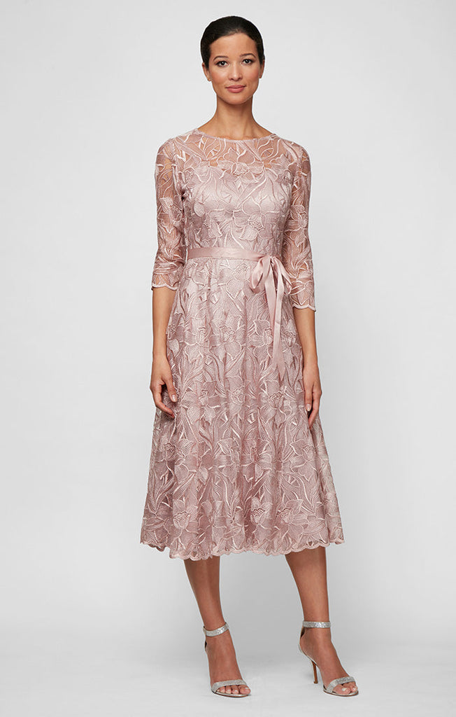 Regular - Midi Length Embroidered Tulle A-Line Dress with Illusion Neckline & Tie Belt