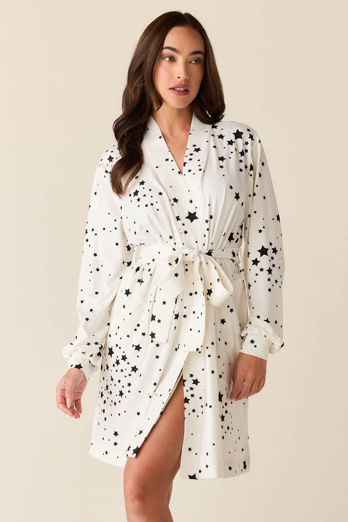 Quinn Cloud Jersey Banded Short Robe in Black Stars